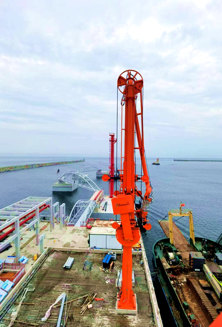 此次安裝的4臺裝卸臂堪稱碼頭“大動脈”,每臺高23.3米、重41.83噸,采用電/液驅(qū)動技術(shù),具備高效、安全、穩(wěn)定的輸油能力,全部投用后,每年可助力完成1650萬噸原油輸送任務(wù),將大幅提升茂名港原油接卸與中轉(zhuǎn)效率。同步安裝的具有浮動功能的登船梯高26.5米、重約32噸,根據(jù)潮汐自動調(diào)節(jié)梯高度的智能設(shè)計,為10萬到30萬噸級的船舶提供了安全便捷的通道;2座高29米的消防炮塔上的消防水炮最大覆蓋半徑達(dá)99米,其射程遠(yuǎn)、流量大,如同“安全衛(wèi)士”構(gòu)筑起碼頭前沿的安全保障網(wǎng)。